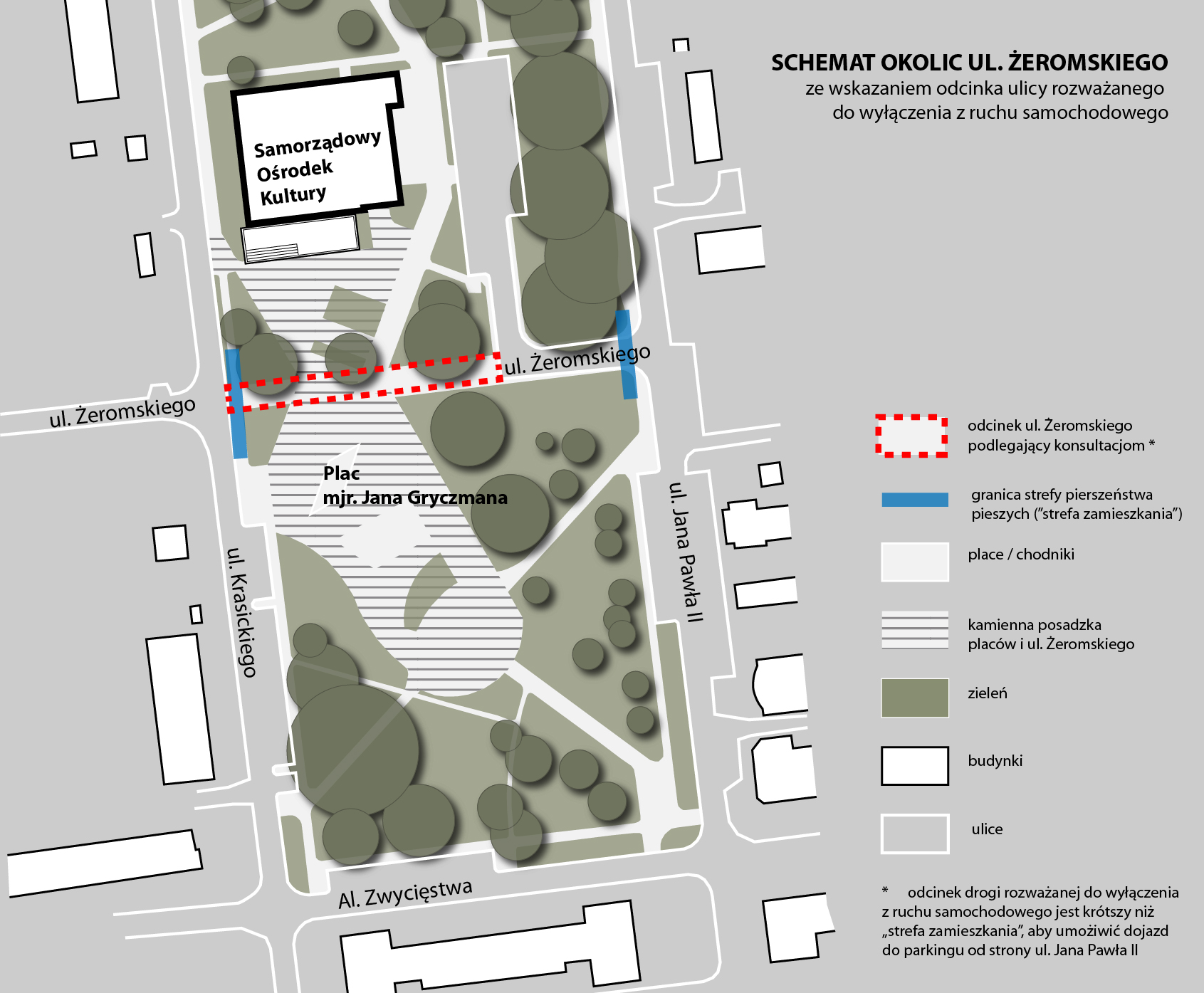 W projekcie rewitalizacji placu mjr Gryczmana i placu przed Samorządowym Ośrodkiem Kultury (2011-2013) pojawił się pomysł wyłączenia 75 metrowego fragmentu ul. Żeromskiego z ruchu samochodowego. Podczas rewitalizacji wymieniono część nawierzchni ulicy na kamienną i zrównano jej poziom z poziomem płyt przyległych placów. W tym czasie zrealizowano również parking przy Samorządowym Ośrodku Kultury z wjazdem od ul. Jana Pawła II. Choć po remoncie przywrócono ruch samochodowy w ul. Żeromskiego, to wprowadzono na odcinku między ul. Jana Pawła II a ul. Krasickiego strefę zamieszkania, co oznacza ograniczenie prędkości dla samochodów do 20 km/h oraz pierwszeństwo pieszych. Parkować wolno jedynie w wyznaczonych miejscach. Zgodnie z informacjami od straży miejskiej, po remoncie nie odnotowano na omawianym odcinku ul. Żeromskiego żadnych wypadków ani kolizji.