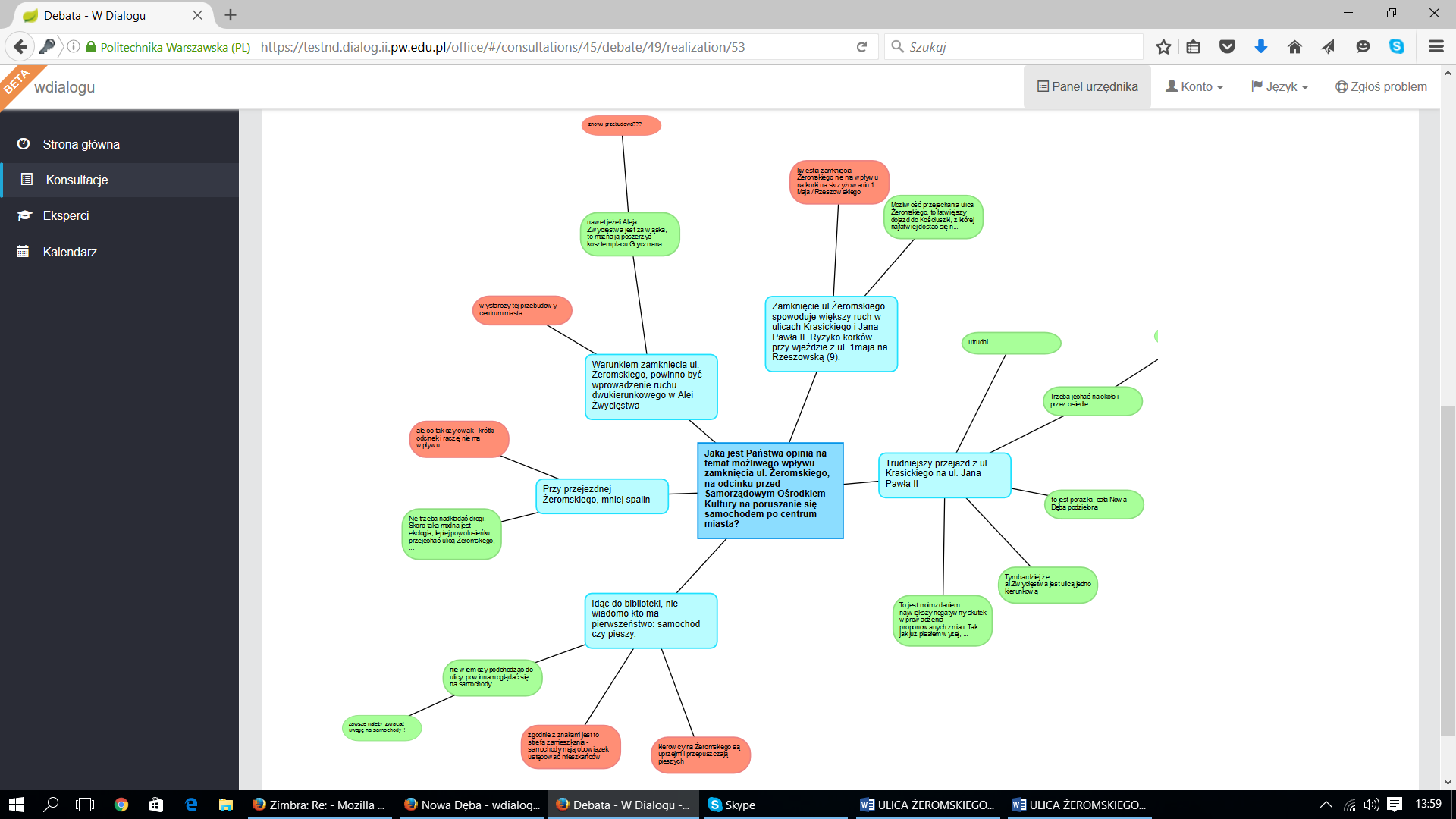 Podczas spotkania bezpośredniego i debaty internetowej na platformie „W Dialogu” wymiana argumentów odbywała się w trzech obszarach szczegółowych dotyczących: komfortu i bezpieczeństwa, codziennego użytkowania ul. S. Żeromskiego i przyległych terenów oraz poruszania się po okolicy samochodem. Pytano mieszkańców zarówno o stan obecny, jak i konsekwencje, które ich zdaniem mogłyby się wiązać z zamknięciem ul. Żeromskiego dla ruchu samochodów.