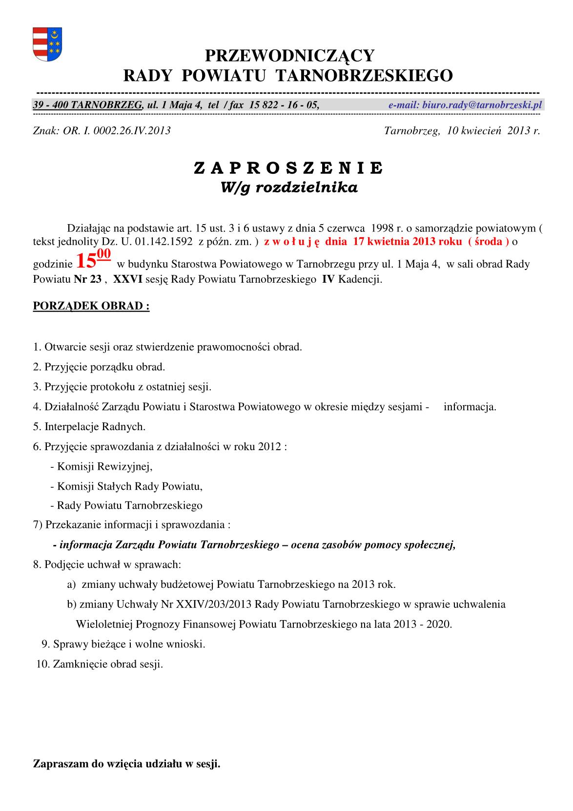 Zaproszenie na XXVI Sesję Rady Powiatu Tarnobrzeskiego