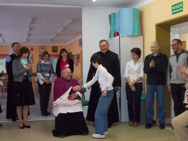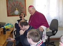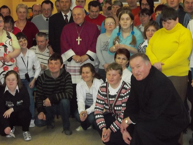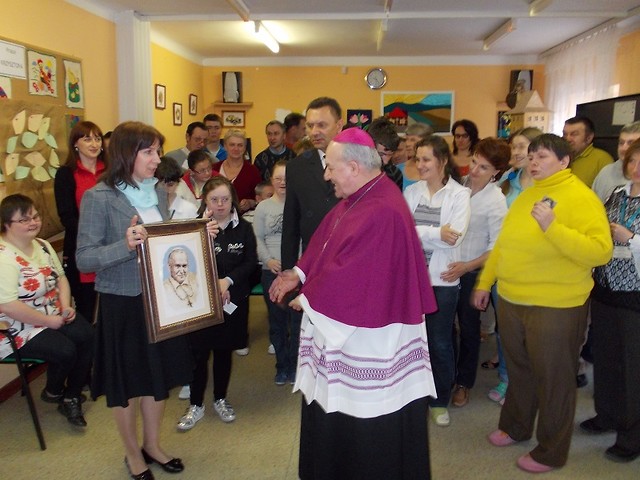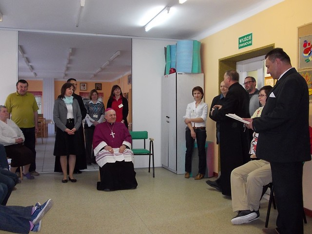 Podczas wizytacji kanonicznej parafii p.w. Matki Bożej Królowej Polski w Nowej Dębie 19 kwietnia 2013 roku nasz ośrodek odwiedził ksiądz biskup Edward Frankowski. Dostojnemu gościowi towarzyszył ksiądz proboszcz Mieczysław Wolanin oraz ksiądz Daniel. Po zwiedzeniu Środowiskowego Domu Samopomocy ksiądz biskup pobłogosławił wszystkich zebranych, rozdał im obrazki, a jeden z uczestników zaprezentował własny wiersz o naszym ośrodku i wiersz o papieżu Franciszku. Na pamiątkę spotkania pani kierownik Gabriela Nowak-Wolwowicz wręczyła przybyłym gościom piękne obrazy i rzeźbę, podkreślając, że prace od podstaw wykonane są w naszym ośrodku podczas zajęć terapeutycznych. Ksiądz biskup podziwiał talenty uczestników uwidocznione w pracach plastycznych, hafciarsko-koronkarskich oraz rzeźbach, a na koniec życzył wszystkim zdrowia, wytrwałości i wzajemnej pomocy.