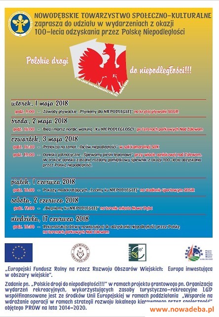 19:00 - Ognisko patriotyczne "Śpiewamy pieśni legionowe" dla mieszkańców Miasta i Gminy Nowa Dęba przy wiacie ogniskowej nad Zalewem. W trakcie ogniska zostanie rozdany pamiątkowy śpiewnik z okazji 100-lecia odzyskania przez Polskę niepodległości (impreza towarzysząca, organizator: Nowodębskie Towarzystwo Społeczno-Kulturalne)