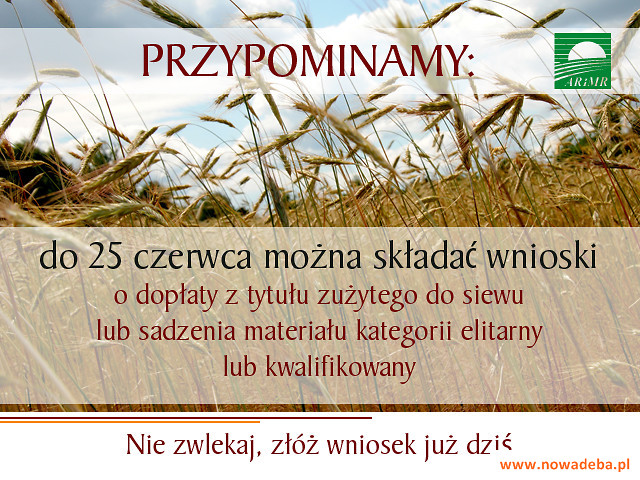 25 czerwca upływa termin na złożenie wniosków o przyznanie dopłaty z tytułu zużytego do siewu lub sadzenia materiału siewnego kategorii elitarny lub kwalifikowany mającej charakter pomocy de minimis w rolnictwie.