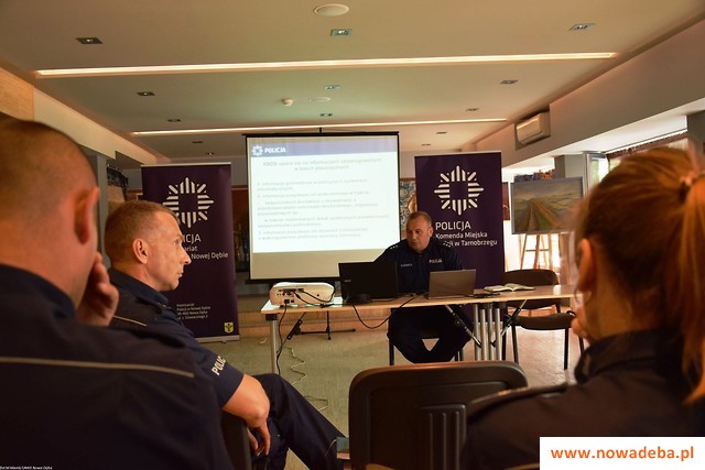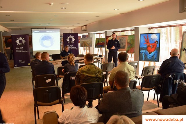 Następnie głos zabrał Komendant Komisariatu Policji w Nowej Dębie kom. Mariusz Stasiak, który przedstawił prezentację multimedialną i przypomniał funkcjonowanie Krajowej Mapy Zagrożeń Bezpieczeństwa. Mówił także o tym, jak wprowadzić informację o danym zagrożeniu lokalnym. Opowiedział jak wygląda weryfikacja wpisów oraz jakich zagrożeń występuje najwięcej. Podkreślił rolę mapy zagrożeń polegającej na możliwości bezpośredniego przekazania policjantom, za pośrednictwem aplikacji internetowej, aktualnych sygnałów o zagrożeniach występujących w najbliższej okolicy.