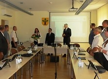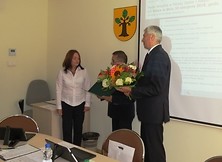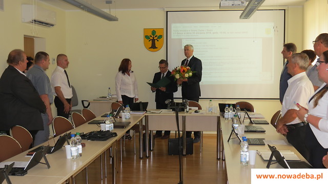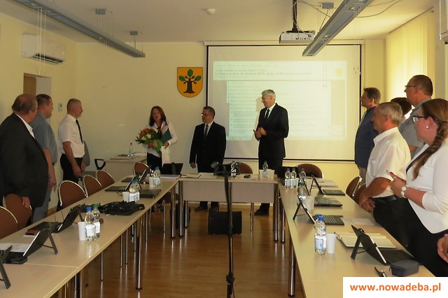 Podczas sierpniowej sesji Przewodniczący Rady Miejskiej Wojciech Serafin, nowodębscy radni oraz burmistrz Wiesław Ordon podziękowali Grażynie Gil za pracę na stanowisku Dyrektora Szkoły Podstawowej w Rozalinie.