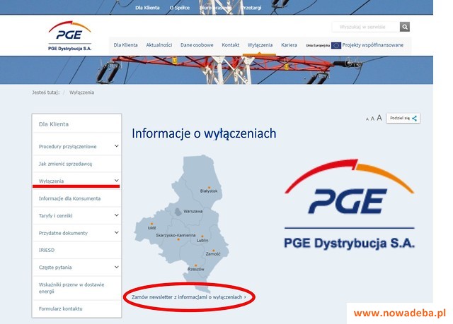 Link kieruje na stronę internetową PGE Dystrybucja S.A. Oddział Rzeszów, gdzie można także zapisać się do newslettera z automatycznymi informacjami o wyłączeniach dla całego rejonu energetycznego lub dla konkretnej lokalizacji.
