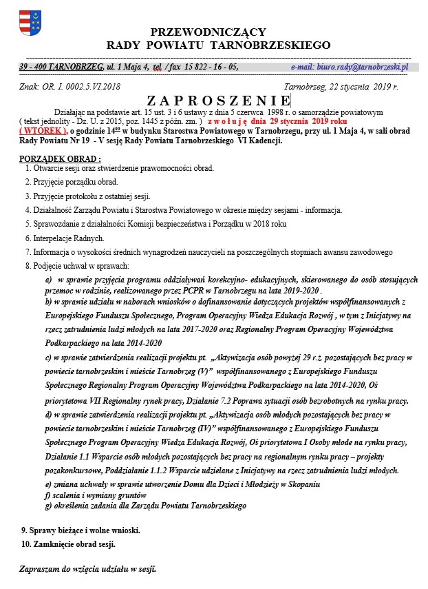 Zaproszenie na V sesję Rady Powiatu Tarnobrzeskiego VI kadencji