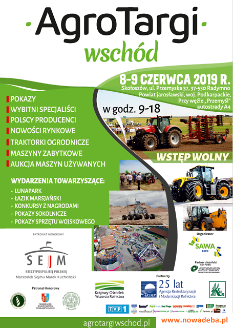 W dniach 8-9 czerwca 2019 r., odbędzie się Tegoroczna edycja Agro Targów Wschód, na terenie zlokalizowanym przy węźle "Przemyśl" autostrady A4 (Skołoszów, ul. Przemyska 37, 37-550 Radymno, Powiat Jarosławski).