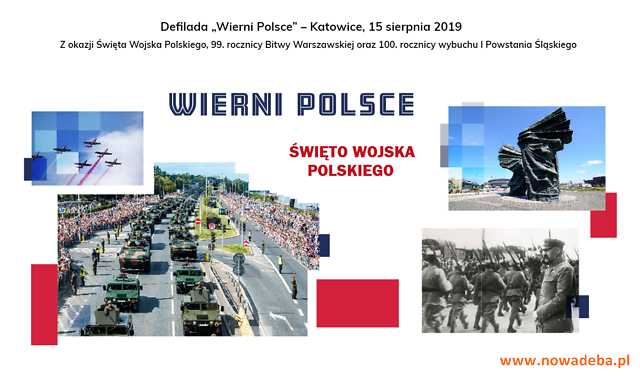 W tym roku główne obchody Święta Wojska Polskiego oraz defilada odbędą się w Katowicach. Defilada „Wierni Polsce”, będąca częścią obchodów Święta Wojska Polskiego w 99. rocznicę Bitwy Warszawskiej oraz 100. rocznicę wybuchu Powstań Śląskich, rozpocznie się o 13:40 na ul. Bagiennej w Katowicach.