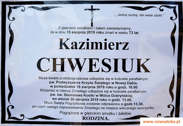 Msza święta przedpogrzebowa odbędzie się w kościele parafialnym pw. Podwyższenia Krzyża Świętego w Nowej Dębie w poniedziałek 19 sierpnia o godz. 16:00.