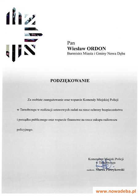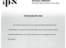 W podziękowaniu za wsparcie dla Policji nadkomisarz Marek Pietrykowski z Komendy Miejskiej Policji w Tarnobrzegu w obecności komendanta Komisariatu Policji w Nowej Dębie nadkomisarza Mariusza Stasiaka przekazał burmistrzowi Nowej Dęby Wiesławowi Ordonowi symboliczny dyplom doceniając jego osobiste zaangażowanie w realizacji ustawowych zadań na rzecz ochrony bezpieczeństwa i porządku publicznego.