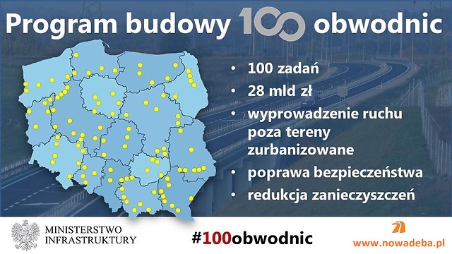 W ramach rządowego programu powstanie 100 obwodnic na sieci dróg krajowych o łącznej długości ok. 820 km. Będą to trasy o najwyższych parametrach technicznych, dostosowane do przenoszenia obciążenia 11,5 t/oś. Inwestycjom tym będą towarzyszyły urządzenia bezpieczeństwa ruchu drogowego, w tym oświetlenie spełniające wytyczne prawidłowego oświetlenia przejść dla pieszych.