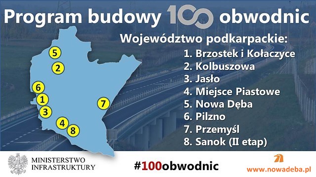 Obwodnica Nowej Dęby znalazła się w rządowym Programie budowy 100 obwodnic przygotowanym przez Ministerstwo Infrastruktury. Oprócz Nowej Dęby, na Podkarpaciu obwodnice zaplanowano także dla Brzoska i Kołaczyc, Kolbuszowej, Jasła, Miejsca Piastowego, Pilzna, Przemyśla oraz Sanoka. Miejscowości te według założeń będą miały obwodnice do 2030 roku. Do tego czasu w całym kraju ma powstać sto obwodnic.
