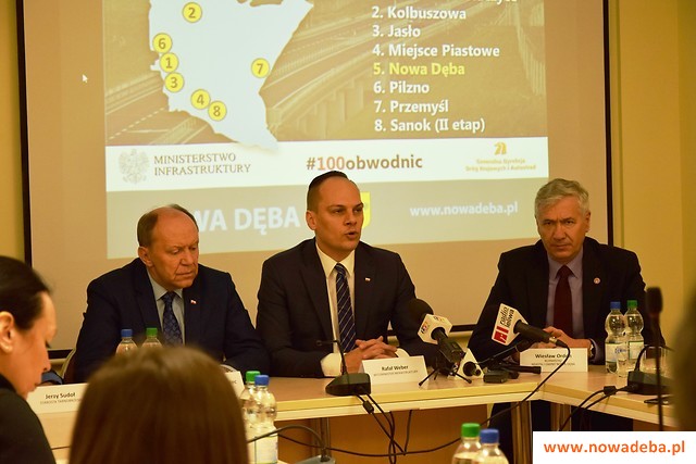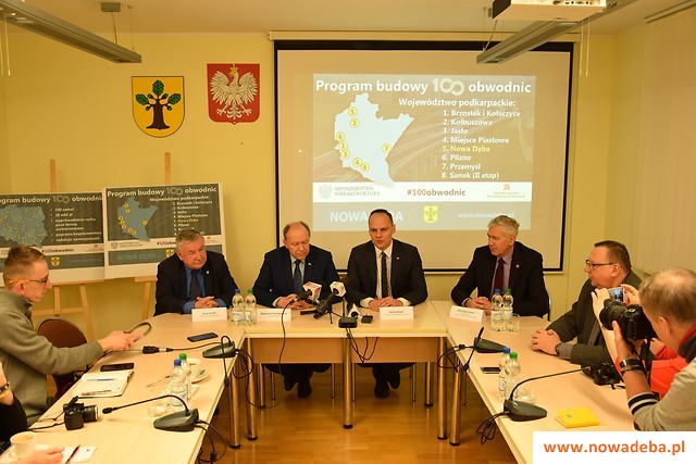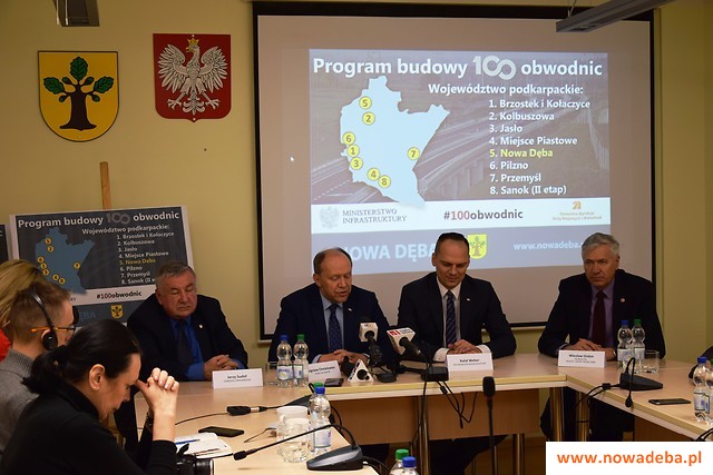 Podczas konferencji prasowej w UMiG Nowa Dęba wiceminister infrastruktury Rafał Weber, poseł Zbigniew Chmielowiec, starosta Jerzy Sudoł i burmistrz Wiesław Ordon poinformowali o rządowych planach budowy obwodnicy Nowej Dęby w ramach Programu budowy 100 obwodnic.