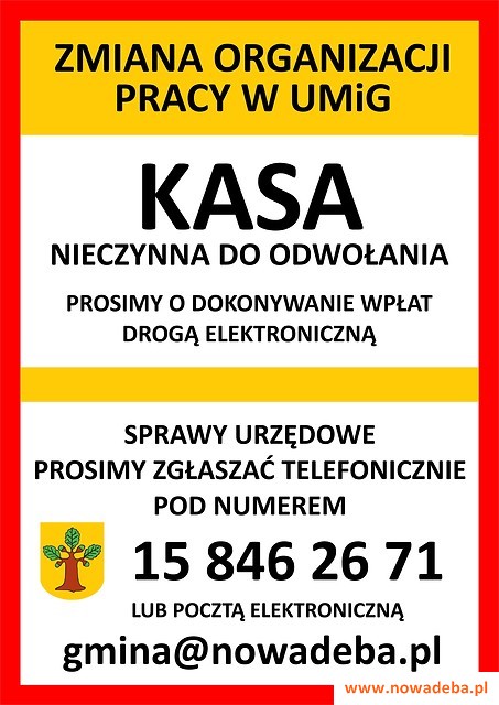 W związku z wprowadzeniem na obszarze Rzeczypospolitej Polskiej stanu zagrożenia epidemicznego od 16 marca br. zmieniamy zasady pracy urzędu. W trosce o pracowników i interesantów będziemy się koncentrować wyłącznie na realizacji zadań niezbędnych do zapewnienia pomocy obywatelom. W zasadzie wyłączymy bezpośrednią obsługę interesantów, pozostawiając ją tylko w sytuacjach niezbędnych dla funkcjonowania mieszkańców. W przypadkach niecierpiących zwłoki zainteresowani będą telefonicznie uzgadniali sposób załatwienia sprawy, w tym stawiennictwa w urzędzie, celem wydania niezbędnego dokumentu.
