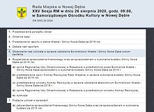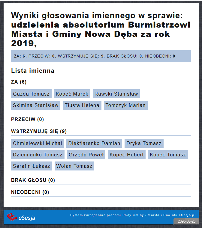 Na sesji Rady Miejskiej, która odbyła się 26 sierpnia 2020 r. radni głosowali m.in. w sprawie udzielenia wotum zaufania dla burmistrza Wiesława Ordona po zapoznaniu się z raportem o stanie miasta i gminy Nowa Dęba za rok 2019 oraz w sprawie udzielenia absolutorium z wykonania budżetu za rok ubiegły.