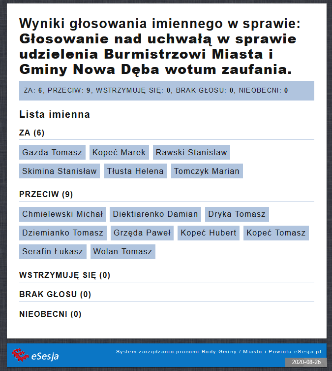 Wśród obecnych na sesji 15 radnych, 9 głosowało przeciw udzieleniu wotum zaufania, a 6 było za udzieleniem wotum zaufania burmistrzowi.