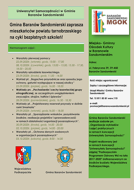 Mając na uwadze potrzeby mieszkańców powiatu tarnobrzeskiego, Gmina Baranów Sandomierski realizuje zadanie pn. ,, Organizacja wykładów i zajęć praktycznych w ramach koncepcji Uniwersytetu Samorządności’’.