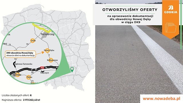 Sześć ofert złożono w przetargu na wykonanie dokumentacji dla budowy obwodnicy Nowej Dęby w ciągu drogi krajowej nr 9. Postępowanie przetargowe dotyczy opracowania Studium korytarzowego, Studium-techniczno-ekonomiczno-środowiskowego z elementami koncepcji programowej oraz uzyskania decyzji o uwarunkowaniach środowiskowych. Teraz rozpoczyna się sprawdzanie złożonych w postępowaniu ofert.
