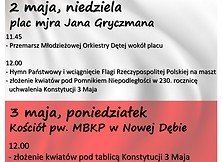 Chcemy jednak mocno wyakcentować znaczenie tych świąt dla naszego narodu, dlatego ich tradycyjne elementy zostaną zroganizowane. Żołnierze Wojska Polskiego z Ośrodka Szkolenia Poligonowego Wojsk Lądowych - Dęba im. płka Jana Szypowskiego "Leśnika" wystawią 2 maja tradycyjny poczet flagowy do wciągnięcia Flagi Rzeczpopolitej Polskiej na maszt, podczas odgrywania Mazurka Dąbrowskiego przez Młodzieżową Orkiestrę Dętą z Chmielowa. Następnie przedstawiciele lokalnego samorządu złożą kwiaty pod Pomnikiem Niepodległości z okazji 230. rocznicy uchwalenia Konstytucji 3 Maja.