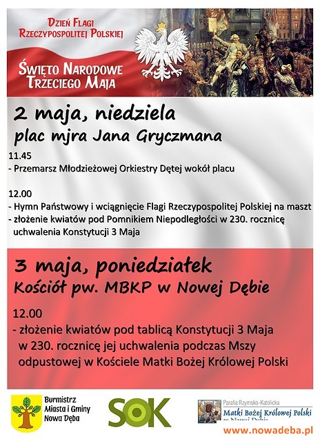 Dzień później - w Święto Narodowe Trzeciego Maja - uczcimy rocznicę uchwalenia Konstytucji z 1791 r. złożeniem kwiatów pod tablicą upamiętniającą to wydarzenie w kościele Matki Bożej Królowej Polski w Nowej Dębie. Będzie miało to miejsce podczas tradycyjnej sumy odpustowej w tej parafii.