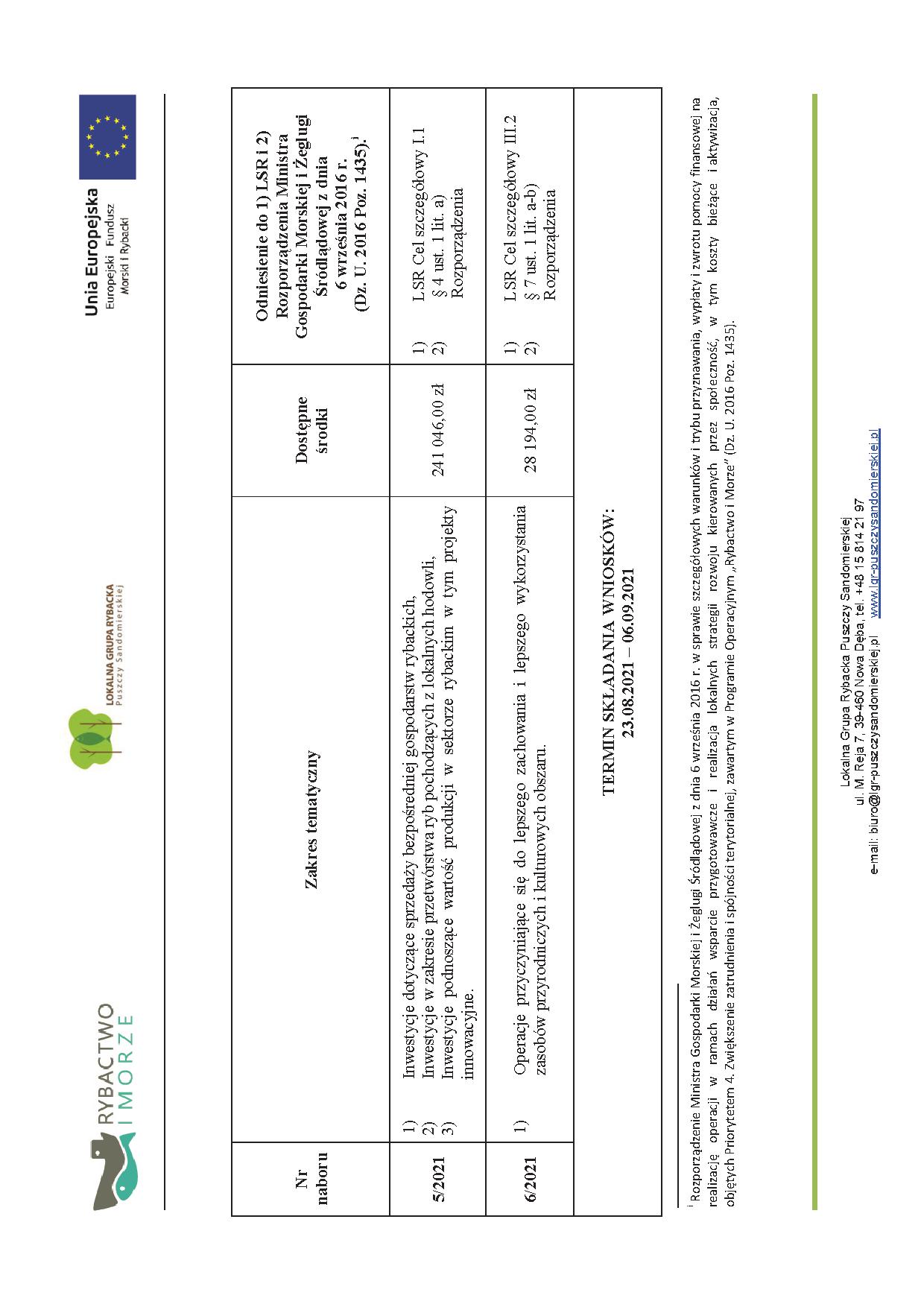 Stowarzyszenie „Lokalna Grupa Rybacka Puszczy Sandomierskiej” działające na terenie gmin: Kolbuszowa, Dzikowiec, Baranów Sandomierski, Nowa Dęba, Grębów, Gorzyce, Bojanów, Zaleszany, Radomyśl nad Sanem, Zaklików, Potok Wielki, Modliborzyce, Janów Lubelski ogłasza nabór wniosków o dofinansowanie w ramach działania „Realizacja lokalnych strategii kierowanych przez społeczność” objętych Priorytetem 4. „Zwiększenie zatrudnienia i spójności terytorialnej” zawartym w Programie Operacyjnym „Rybactwo i Morze” na lata 2014-2020 (PO RYBY).