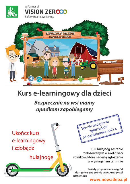 Kasa Rolniczego Ubezpieczenia Społecznego zaprasza dzieci rolników urodzone w latach 2007-2015 do udziału w kursie e-learningowym pt. „Bezpiecznie na wsi mamy – upadkom zapobiegamy”, który w nowoczesnej formie przybliża zagrożenia wypadkowe w gospodarstwach rolnych, a także uczy prawidłowych zachowań podczas przebywania na terenie obejścia. Wśród tych, którzy go ukończą i prześlą swoje zgłoszenia, rozlosujemy 100 hulajnóg.