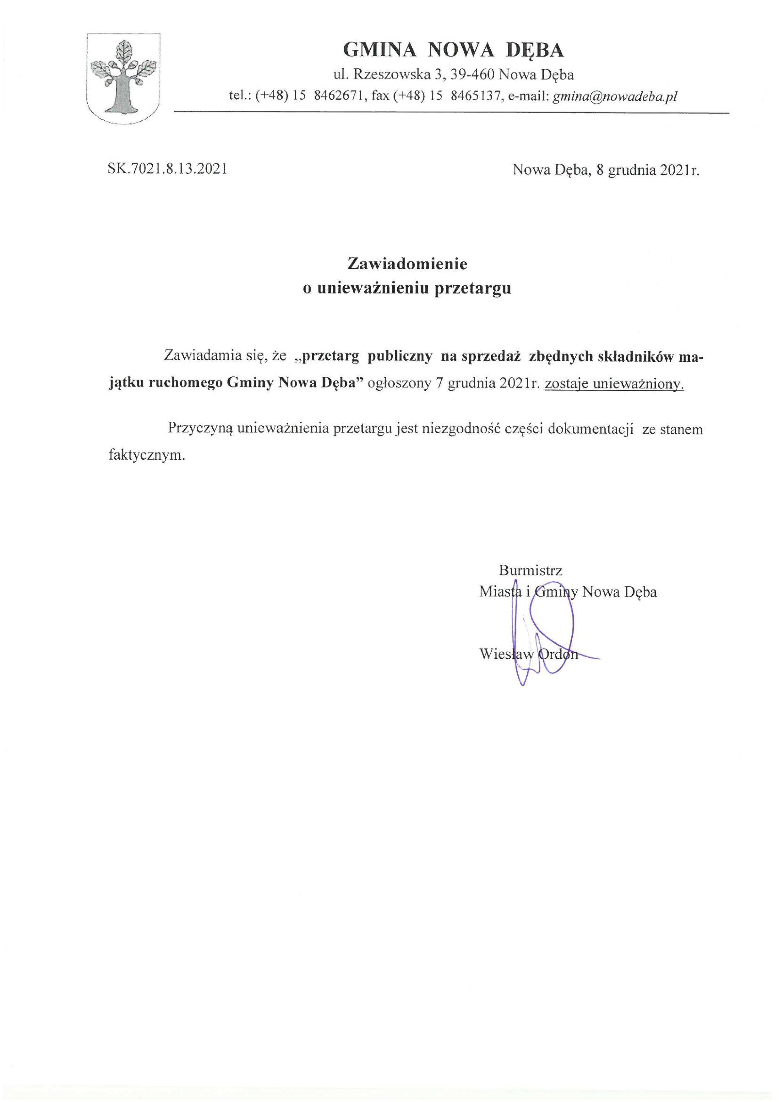 Zawiadomienie o unieważnieniu PRZETARGU!