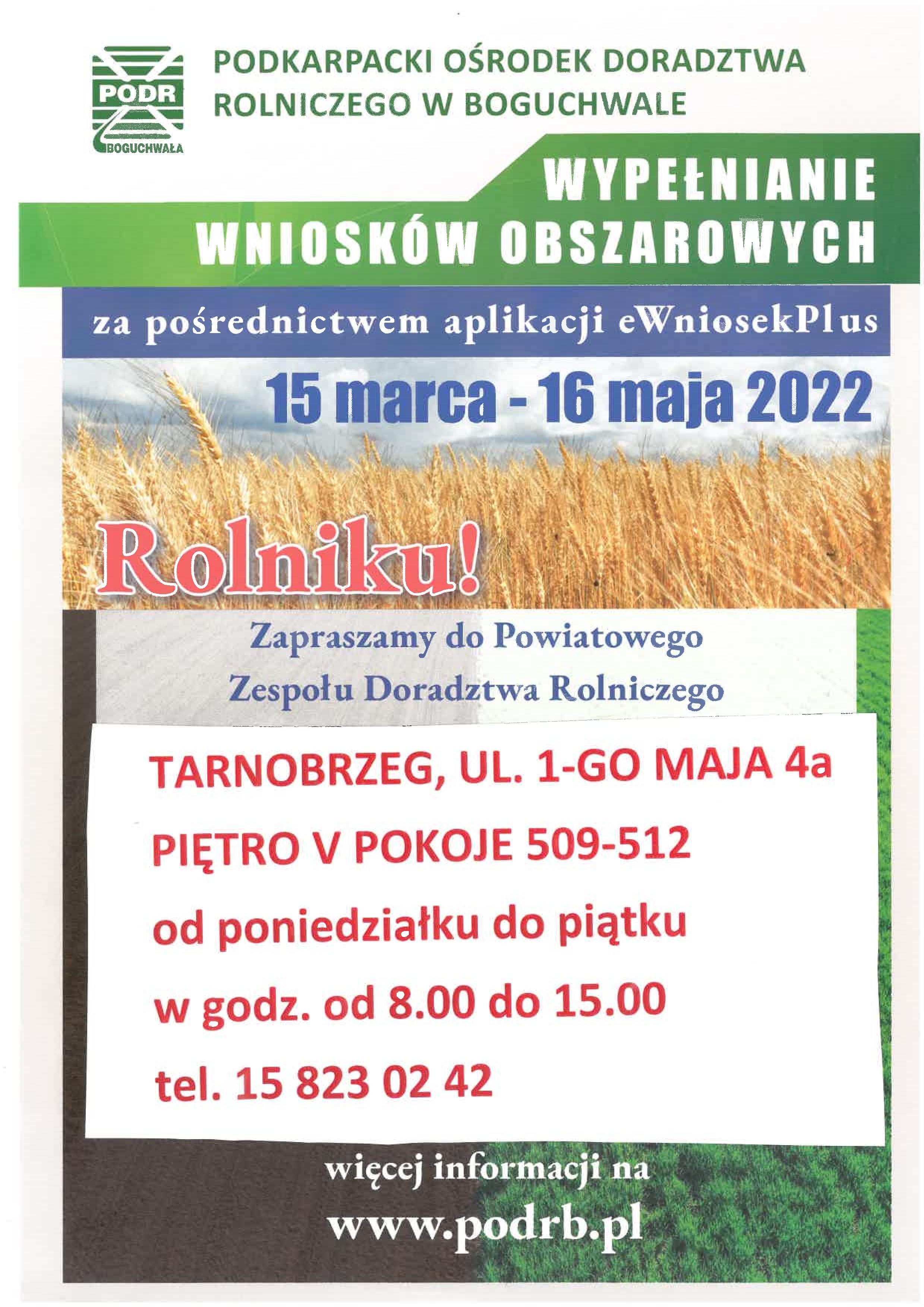 Podkarpacki Ośrodek Doradztwa Rolniczego w Boguchwale zaprasza rolników do wypełniania wniosków obszarowych za pomocą aplikacki eWniosekPLUS w Powiatowym Zespole Doradztwa Rolniczego w Tarnobrzegu przy ul. 1go Maja 4, Piętro 5, pokoje 509-512. WYPEŁNIANIE ODBĘDZIE SIĘ W DNIACH OD 15 marca do 16 maja 2022 r., w godzinach od 8.00 do 15.00.