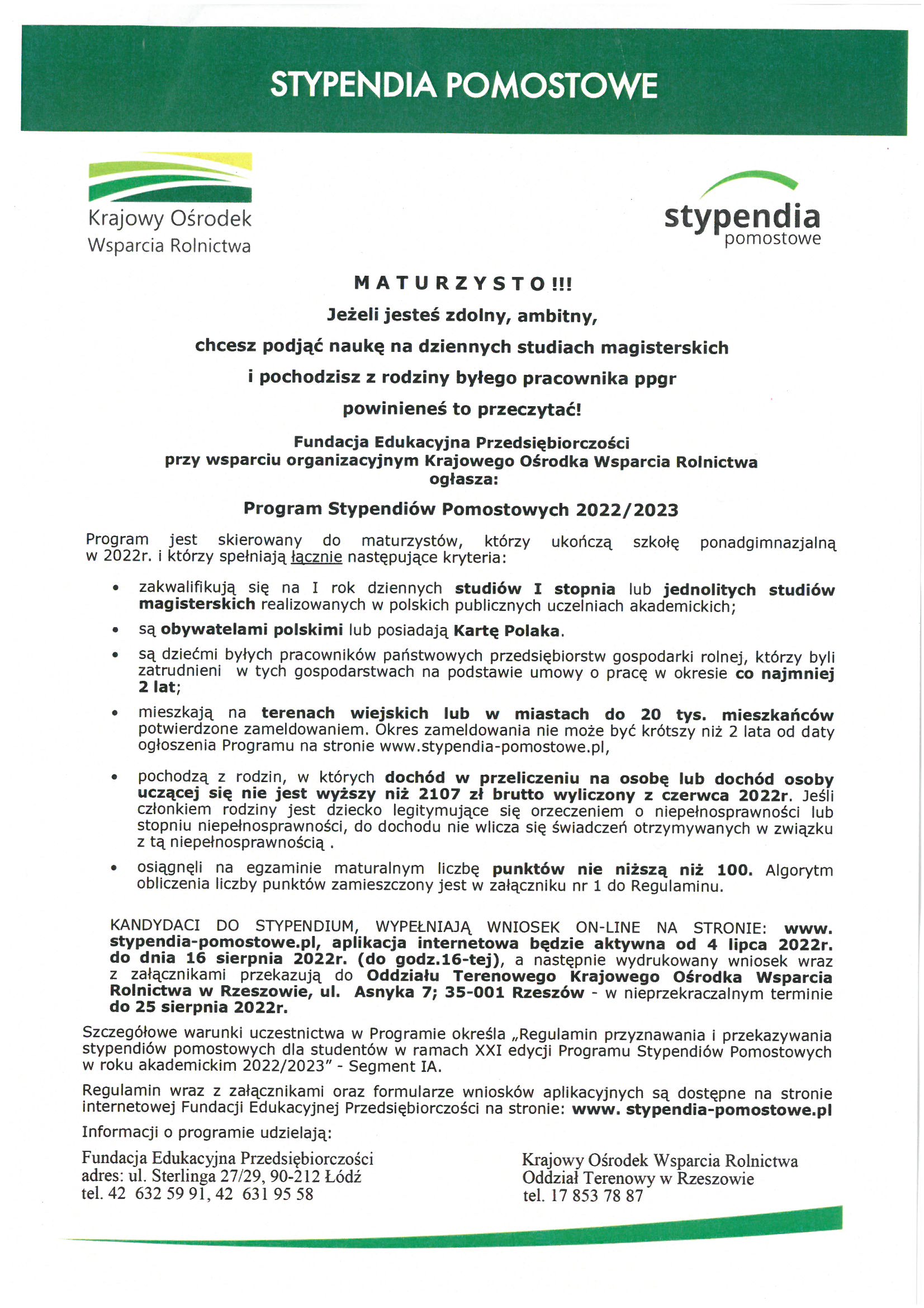STYPENDIA POMOSTOWE 2022/2023 DLA MATURZYSTÓW !!