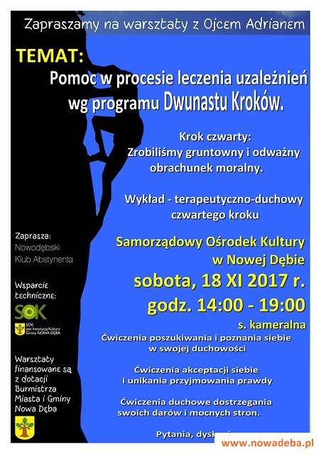 W sobotę 18 listopada 2017 r., w godz. od 14.00 do 19.00 w Samorządowym Ośrodku Kultury w Nowej Dębie – sala kameralna, odbędą się kolejne warsztaty dotyczące problematyki uzależnień i sposobów radzenia sobie z nim. Ten cykl warsztatów prowadzi znany nam już duchowny, Ojciec Adrian. Tematem przewodnim warsztatów będzie „Pomoc w procesie leczenia zespołu uzależnień programu DWUNASTU KROKÓW”, który został rozpoczęty w ubiegłum roku. Tym razem czas na krok czwarty: "Zrobiliśmy gruntowny i odważny obrachunek moralny". Organizatorem warsztatów jest Nowodębski Klub Abstynenta, który serdecznie zaprasza do wzięcia w nich udziału wszystkich chętnych, dla których problem uzależnień nie jest obojętny lub obcy.