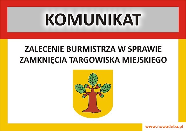 W związku z ogłoszonym na terytorium Rzeczypospolitej Polskiej stanem epidemii związanym z zakażeniami wirusem SARS-CoV-2 (COVID 19), w celu maksymalnego ograniczenia ryzyka pojawienia się wirusa na terenie Nowej Dęby, burmistrz miasta i gminy Nowa Dęba zaleca zamknięcie Targowiska Miejskiego w Nowej Dębie przy ul. Krasickiego do odwołania.