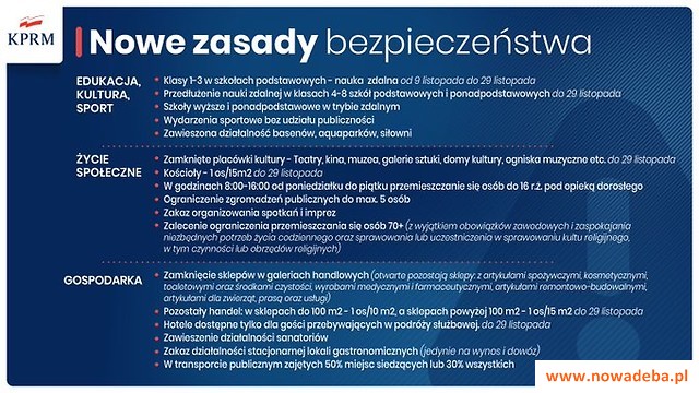 Od 9 listopada klasy 1-3 szkół podstawowych przejdą na naukę zdalną. Wszyscy uczniowie i studenci będą uczyć się w domu do 29 listopada. Placówki kultury, m.in. kina i muzea, będą niedostępne dla publiczności. Zmniejszamy także limit osób przebywających w sklepach oraz kościołach. Ograniczamy także działalność galerii handlowych. Hotele będą dostępne tylko dla gości podróżujących służbowo. Cała Polska jest wciąż w czerwonej strefie, a dotychczasowe środki bezpieczeństwa nadal obowiązują. Zdecydowane kroki i społeczna dyscyplina to jedyna szansa, aby zatrzymać przyrost zakażeń i zapobiec całkowitemu zamknięciu gospodarki.