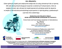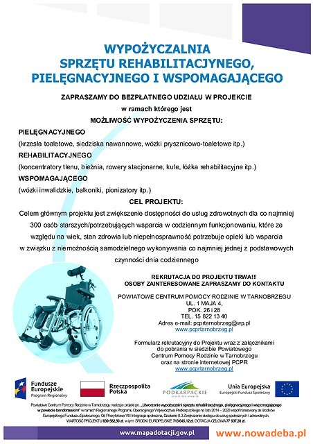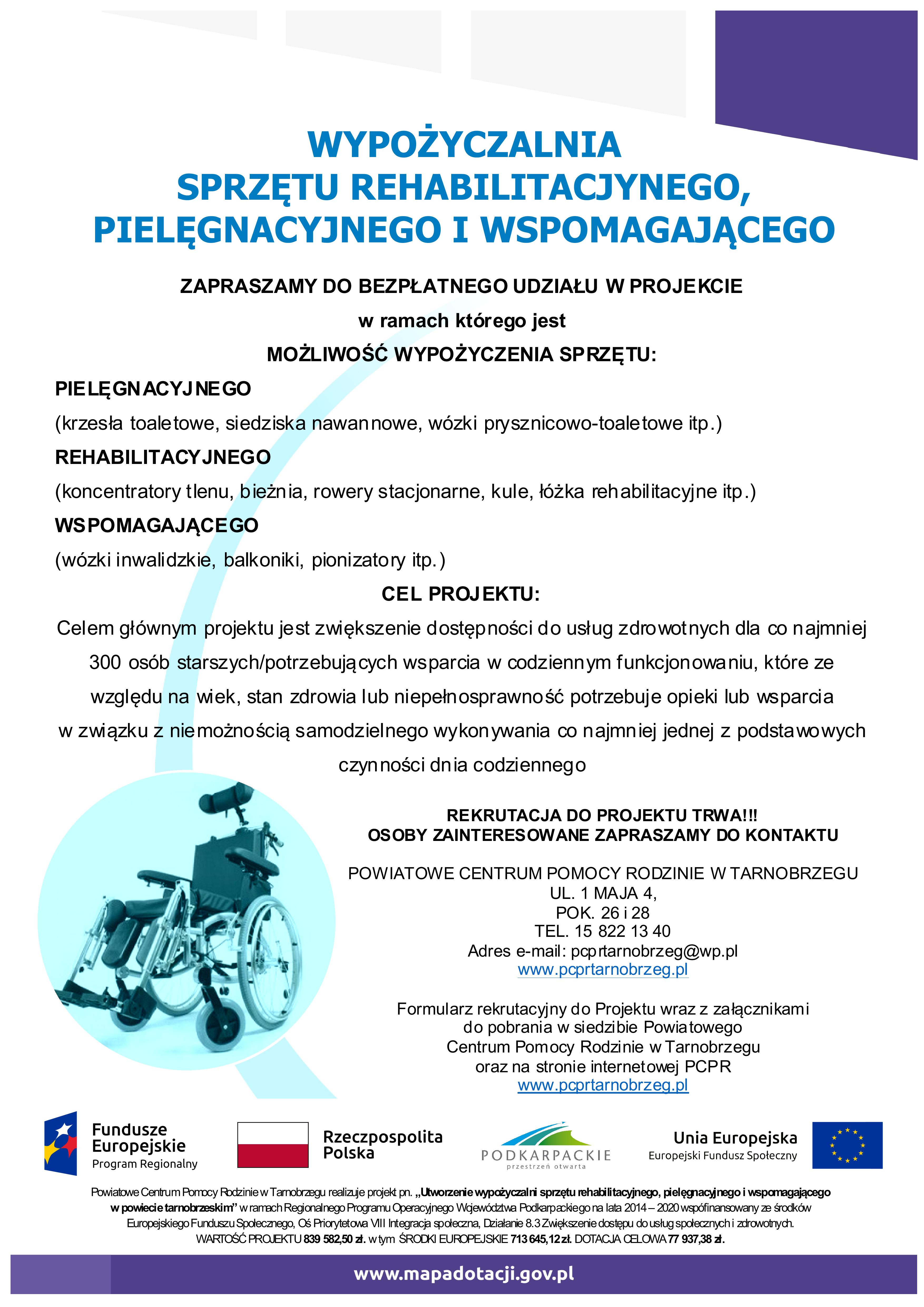 Powiat Tarnobrzeski/Powiatowe Centrum Pomocy Rodzinie w Tarnobrzegu realizuje projekt pn. „Utworzenie wypożyczalni sprzętu rehabilitacyjnego, pielęgnacyjnego i wspomagającego w powiecie tarnobrzeskim” na podstawie umowy z Wojewódzkim Urzędem Pracy w Rzeszowie w ramach konkursu Regionalnego Programu Operacyjnego Województwa Podkarpackiego na lata 2014-2020, Oś Priorytetowa VIII Integracja społeczna, Działanie: 8.3 Zwiększenie dostępu do usług społecznych i zdrowotnych.