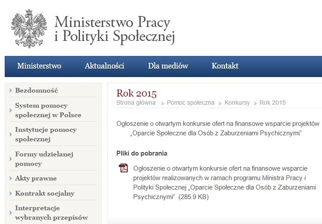 Ministerstwo Pracy i Polityki Społecznej ogłosiło otwarty konkurs ofert na finansowe wsparcie projektów realizowanych w ramach programu "Oparcie społeczne dla osób z zaburzeniami psychicznymi".