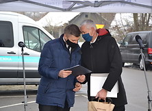 Burmistrz podkreślał także rolę samorządowców kilku kadencji: z lat 2002-06, którzy pozyskali grunty od chmielowskich rolników, z kadencji 2014-18, którzy przystąpili do zmiany planu zagospodarowania terenu oraz obecnym, za uchwalenie planu oraz przekazanie gruntów. Na konferencji obecni byli obecny przewodniczący Rady Miejskiej Damian Diektiarienko i wiceprzewodniczący Tomasz Wolan, którzy razem z burmistrzem wręczyli gościom spoza gminy publikację o Tadeuszu Śmiśniewiczu, dyrektorze technicznym Wytwórni Amunicji nr 3 w Dębie.