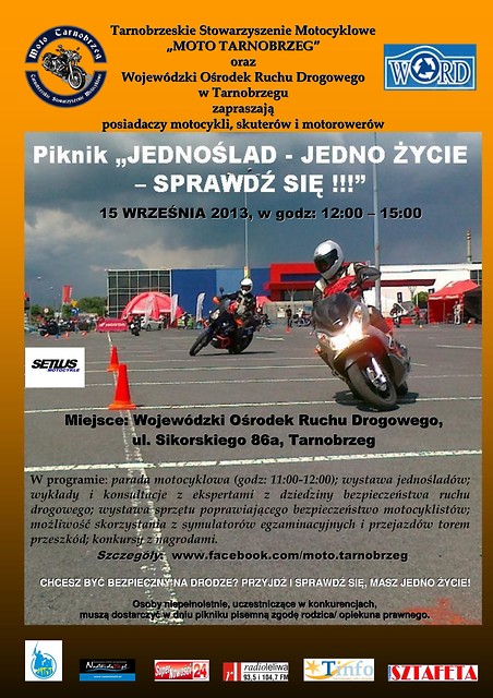 Tarnobrzeskie Stowarzyszenie Motocyklowe "MOTO TARNOBRZEG" i Wojewódzki Ośrodek Ruchu Drogowego w Tarnobrzegu zaprasza na Piknik dla posiadaczy motocykli, skuterów i motorowerów "JEDNOŚLAD - JEDNO ŻYCIE - SPRAWDŹ SIĘ !!!"