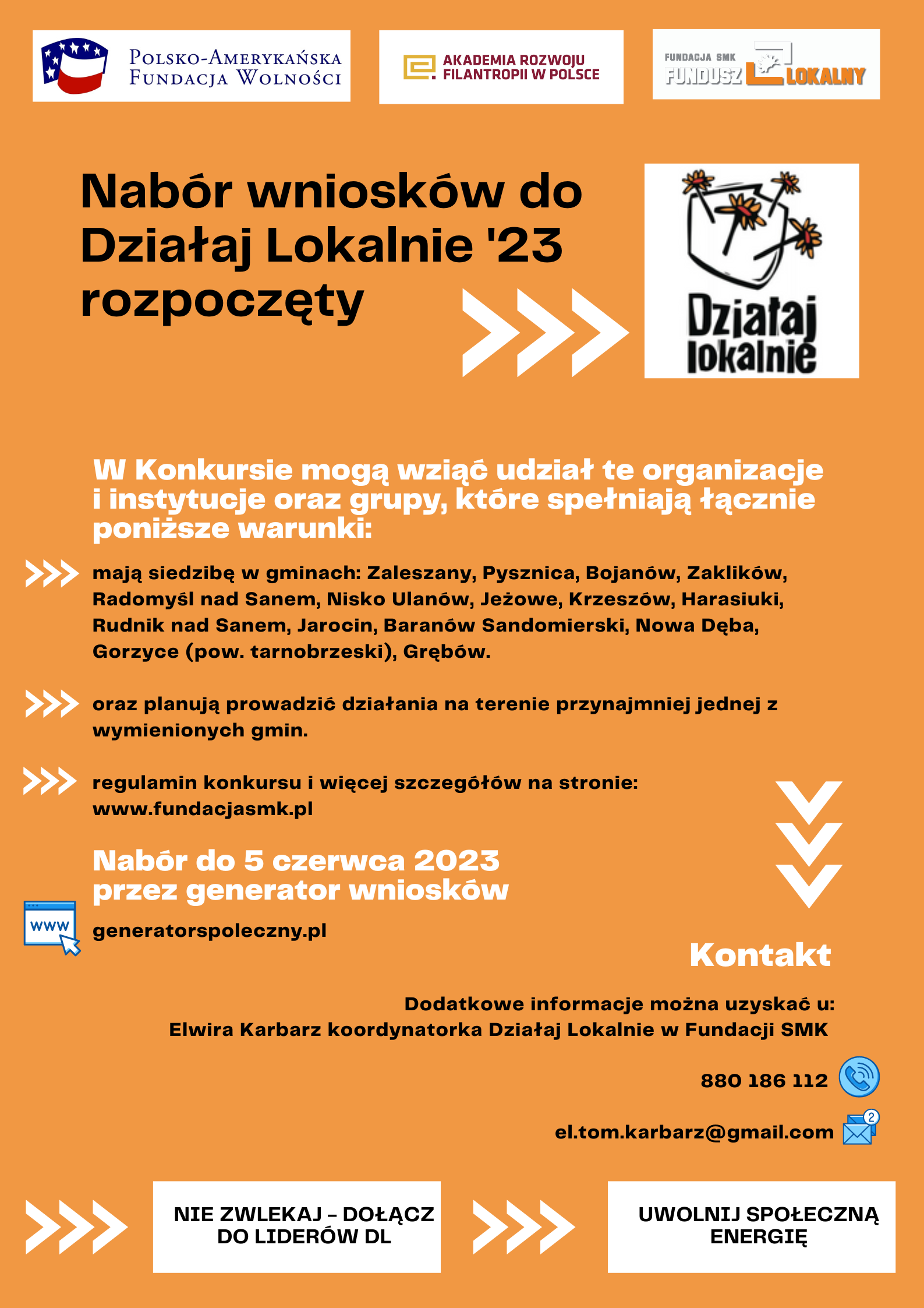 Fundacja Fundusz Lokalny SMK ogłasza, że rozpoczęła nabór do lokalnego konkursu grantowego Działaj Lokalnie, który potrwa do 5 czerwca 2023 przez generator wniosków znajdujący się po adresem generatorspoleczny.pl.