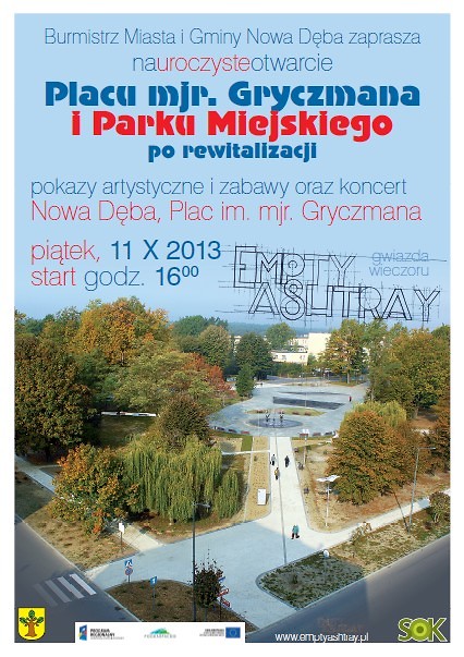Na podsumowanie uroczystego otwarcia zapraszamy na plac przed SOK, gdzie wystąpi krakowski zespół Empty Ashtray z nowodębskimi korzeniami – rockowe fundamenty z eklektycznym wykończeniem; ich debiutancka płyta ukaże się już wkrótce, bo 25 października 2013 r. Zespół liczy cztery osoby, a są to: nowodębianie Mariusz i Tomasz Bysiewiczowie, Paweł Woźniak oraz gliwiczanin Bartosz Szadkowski. Muzycy na co dzień ćwiczą w Krakowie (czasami w Nowej Dębie), sami piszą teksty i grają wyłącznie własne kawałki. Zespół Empty Ashtray trafił do finału I edycji konkursu Radia Kraków MEGAFON 2012.