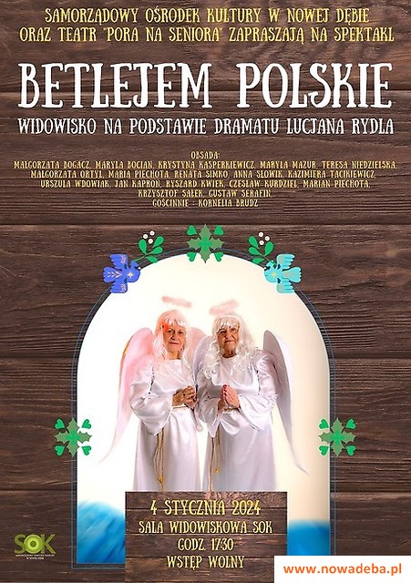 Teatr „Pora na Seniora" zaprasza 4 stycznia 2024 r. o godz.17.30 na niezwykłe widowisko oparte na dramacie Lucjana Rydla "Betlejem Polskie". Rydlowskie "Betlejem..." dzieje się jednocześnie w trzech planach czasowych – w polskiej współczesności, w naszej rodzimej historii i w czasach biblijnych. Jest wpisane w polski krajobraz i rzeczywistość historyczną – ożywia przeszłość. Jezus rodzi się tu wśród polskiej zimy, a Betlejem leży w Polsce w naszej rodzimym Podkarpaciu i Małopolsce a może na Kaszubach. Biblijny Herod nie jest tylko władcą starożytnej Palestyny, lecz ciemiężycielem Polski i rusyfikatorem; betlejemscy Trzej Królowie to nasi władcy: Kazimierz Wielki, Władysław Jagiełło i Jan III Sobieski. Scenariusz spektaklu nawiązuje do najwspanialszych kart naszej historii. Jest to patriotyczne, rozśpiewane widowisko z humorem, tańcem, Świętą Rodziną.