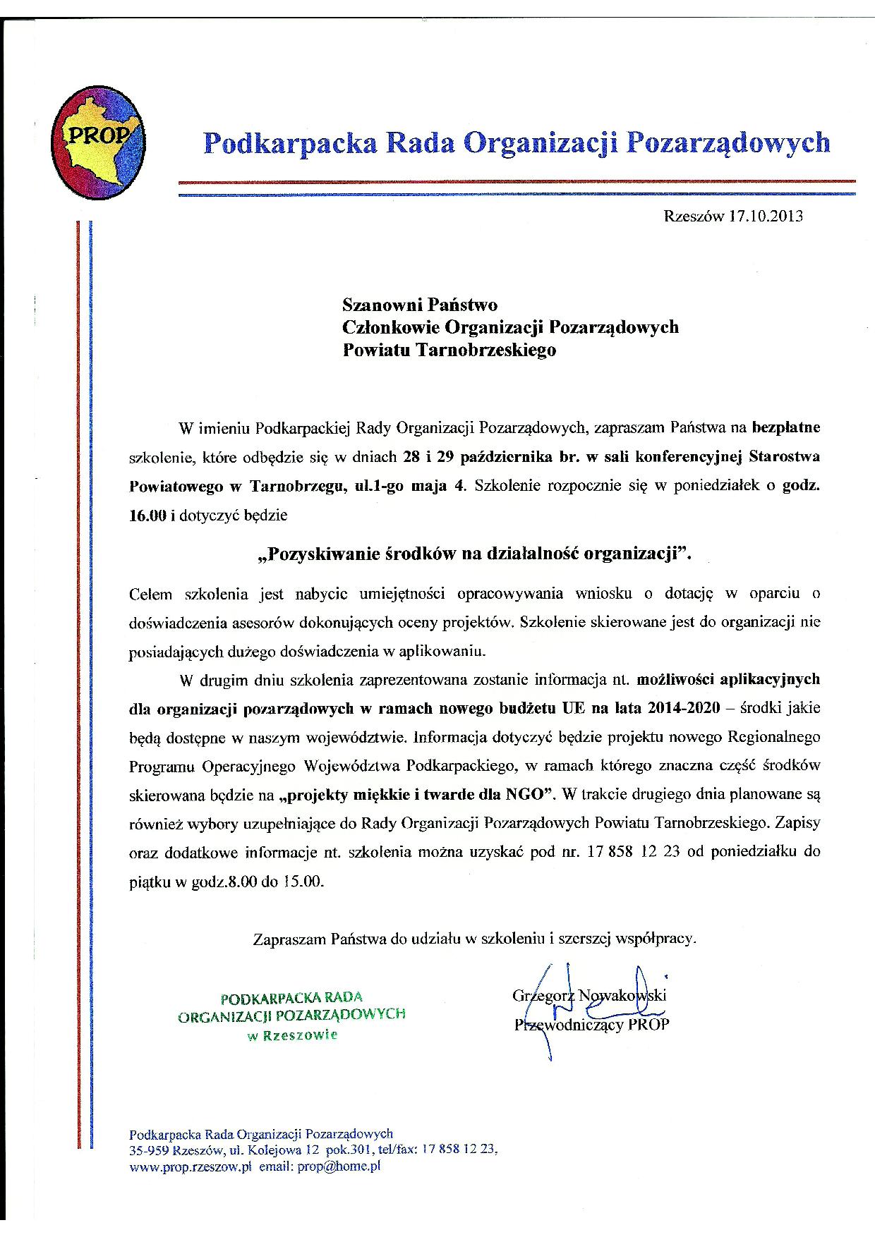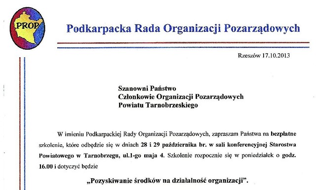 Zaproszenie na szkolenie 'Pozyskiwanie środków na działalność organizacji'