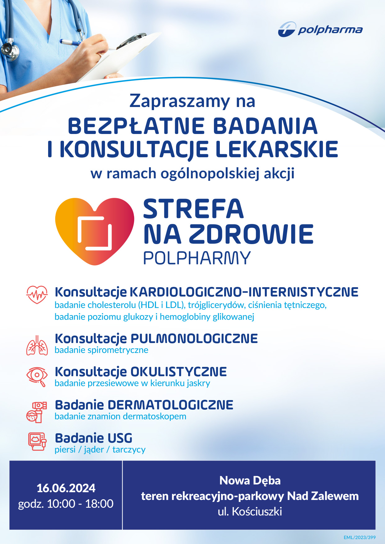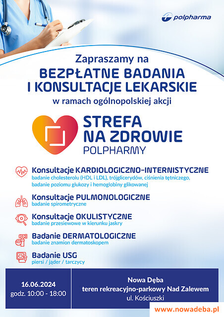 Zapraszamy mieszkańców Nowej Dęby na bezpłatne badania w ramach akcji Strefa na Zdrowie zainicjowanej przez firmę Polpharma. Inicjatywa ta ma na celu zapewnienie dostępu do podstawowych badań medycznych i promocję profilaktyki zdrowotnej wśród lokalnej społeczności.