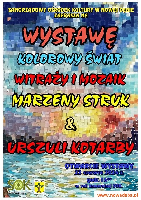 Samorządowy Ośrodek Kultury w Nowej Dębie zaprasza 22 czerwca 2024 r. o godz. 16:00 na wernisaż WYSTAWY „KOLOROWY ŚWIAT WITRAŻY I MOZAIK” MARZENY STRUK I URSZULI KOTARBY. Świata tak innego od tego, który znamy na co dzień. Gra kolorów i światła tworzy niepowtarzalny klimat wystaw tego typu sztuki z wykorzystaniem szkła oraz ceramiki. Wystaw, stosunkowo rzadko prezentowanych. Taka trochę inna bajka z którą mamy zamiar zapoznać zwiedzających. Ekspozycja witraży i mozaik nie musi kojarzyć się tylko ze sztuką sakralną. Może być piękną ozdobą naszych domów, możemy również obdarować przyjaciół oryginalnym prezentem. Naszym celem jest upiększanie i kolorowanie codziennego świata. Malujemy szkłem, ceramiką, kamieniem. "Świat bez nas byłby szary…".