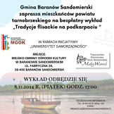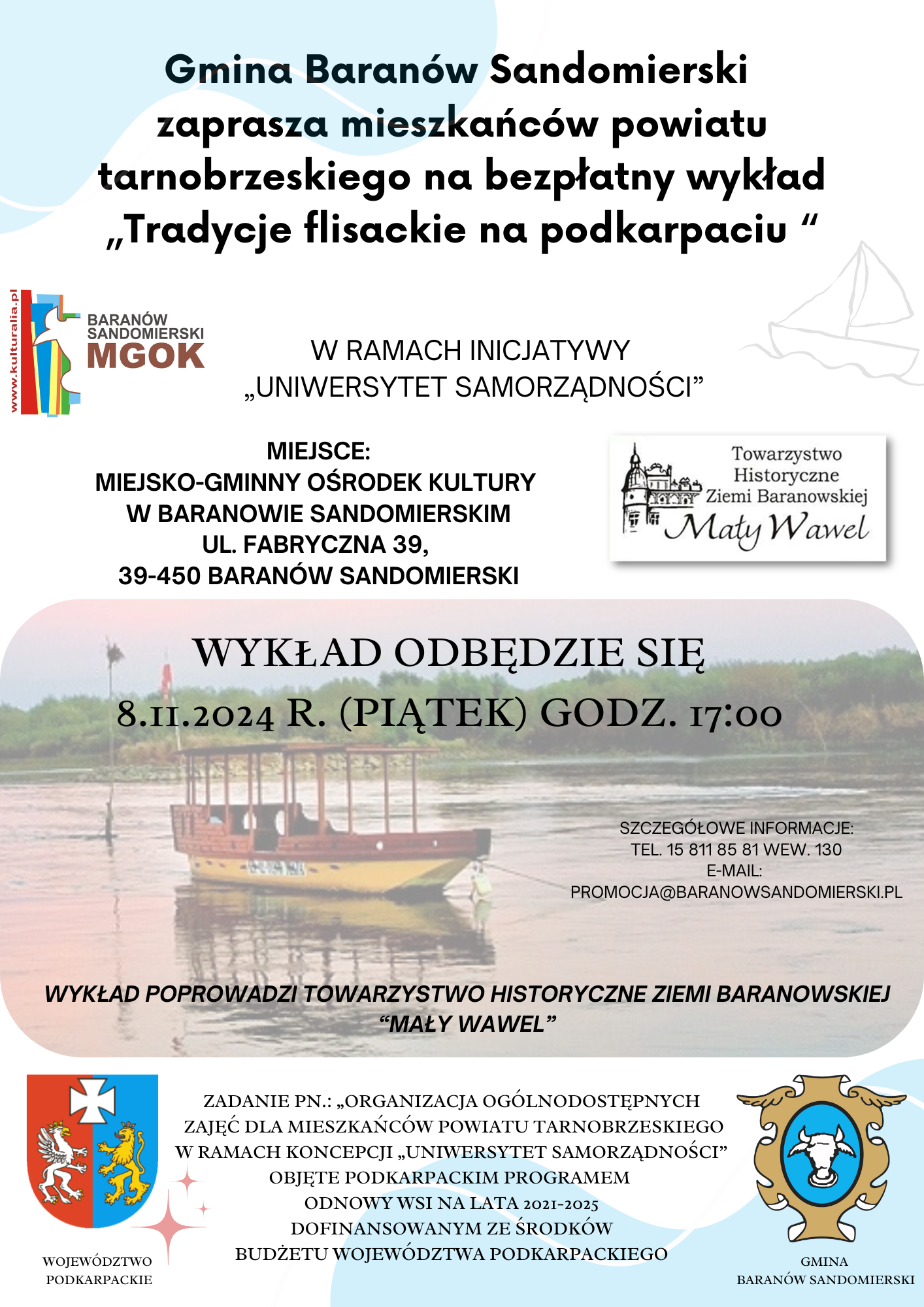 Wykład z bloku historycznego „Tradycje flisackie na podkarpaciu“ odbędzie się 08.11.2024 r. o godzinie 17:00 w Miejsko-Gminnym Ośrodku Kultury w Baranowie Sandomierskim, ul. Fabryczna 39, 39-450 Baranów Sandomierski. Wykład poprowadzi Towarzystwo Historyczne Ziemi Baranowskiej “Mały Wawel”.