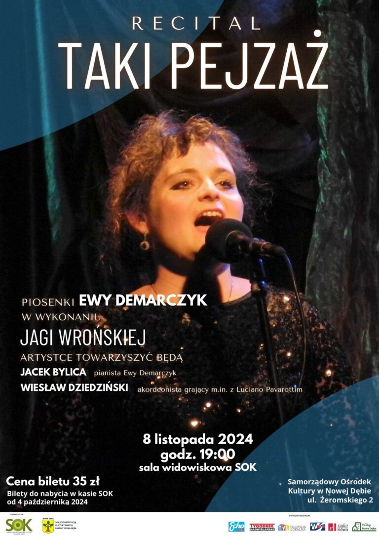 „Taki Pejzaż” To recital w którym artystka Jaga Wrońska wykonuje największe przeboje Ewy Demarczyk… Artystce będą towarzyszyć wyjątkowi muzycy: Jacek Bylica – pianista Ewy Demarczyk oraz Wiesław Dziedziński – akordeonista grający m.in. z Luciano Pavarottim.