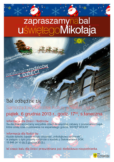 Serdecznie zapraszamy wszystkie dzieci do wspólnej zabawy z postaciami z bajek, które umilą czas oczekiwania na wspaniałego gościa. Każde dziecko będzie mogło otrzymać „mikołajkowy upominek”, w związku z tym prosimy rodziców o kontakt z Sekretariatem SOK osobiście lub telefonicznie do 5 grudnia 2013 r.