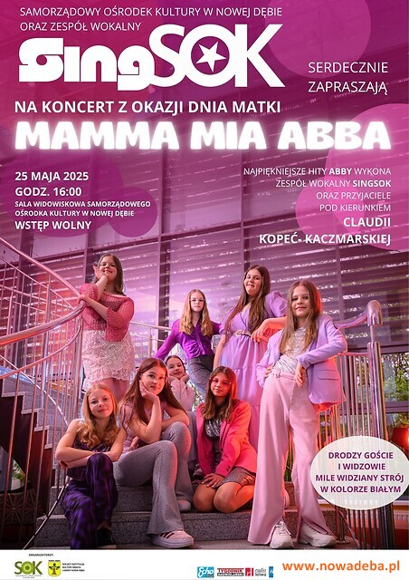 Nasz zespół wokalny SINGSOK szykuje muzyczną nie lada gratkę z okazji Dnia Matki. Koncert z najpiękniejszymi przebojami ABBY. Jest to pozycja obowiązkowa dla fanów ABBY i nie tylko. Zapraszamy więc 25 maja (niedziela) 2025 r. o godz. 16:00 na salę widowiskową Samorzadowego Ośrodka Kultury w Nowej Dębie.