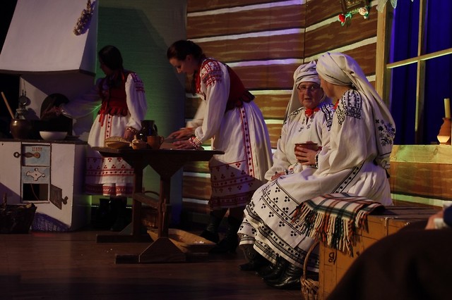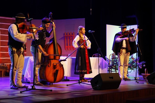 Po krótkim występie przedstawicielki Akcji Katolickiej, która przedstawiła genezę wieczerzy wigilijnej, nastąpiła wspólna modlitwa i pobłogosławienie opłatków wigilijnych przez ks. dr Mieczysława Wolanina, którymi dzieliliśmy się podczas drugiej części biesiady. W krótkim nawiązaniu do modlitwy dyrektor SOK Krystian Rzemień podkreślił, że chrześcijaństwo jest nieodłącznym elementem naszej kultury, która zbudowana została właśnie na jego fundamentach. Następnie miało miejsce przekazanie światełka betlejemskiego od nowodębskich harcerzy dla wszystkich mieszkańców. W imieniu społeczności miasta i gminy odebrali je: Wojciech Serafin – Przewodniczący Rady Miejskiej oraz pani Zofia Strzelczyk. Równie ważnym wydarzeniem było wręczenie statuetek „Mecenas Kultury” dla osób, które w sposób szczególny przyczyniły się do krzewienia kultury na naszym terenie. Na scenie SOK zaprezentowano również przedstawienie „Wigilia Staropolska” przygotowane przez młodzież działającą w grupach teatralnych w SOK oraz członków „Klubu Złotego Wieku”. Nie zabrakło kolęd i pastorałek w wykonaniu kapeli „Góralska Hora”. Po wspólnym kolędowaniu nastąpiło łamanie się wigilijnym opłatkiem, składanie świątecznych życzeń oraz spożywanie wigilijnych potraw rybnych, z terenów Lokalnej Grupy Rybackiej Puszczy Sandomierskiej.