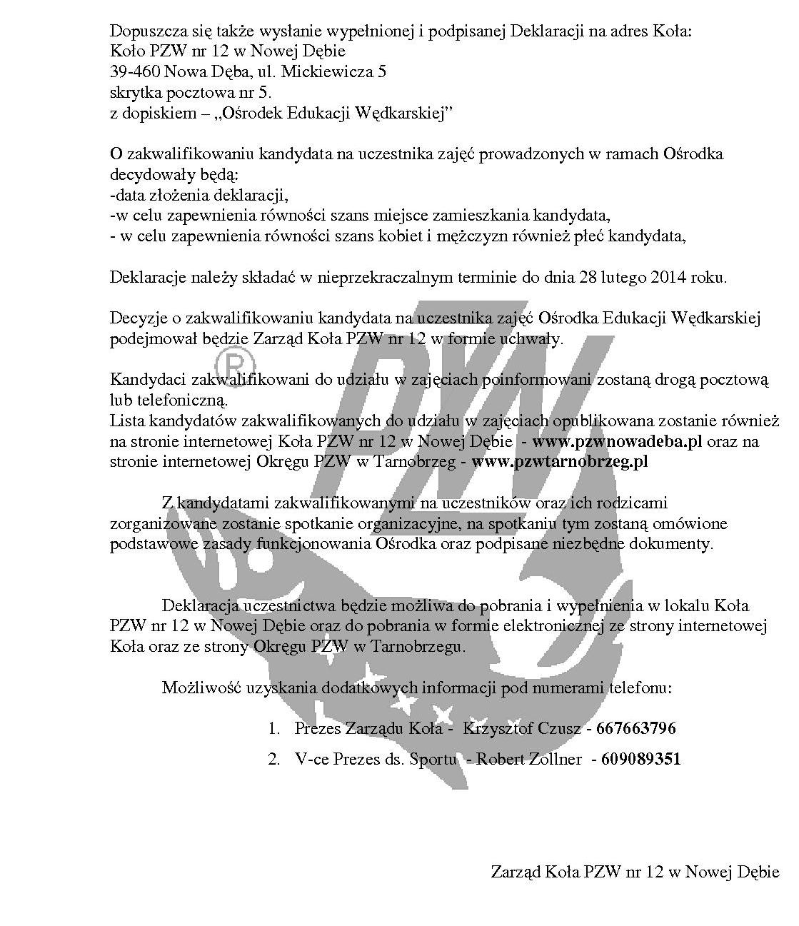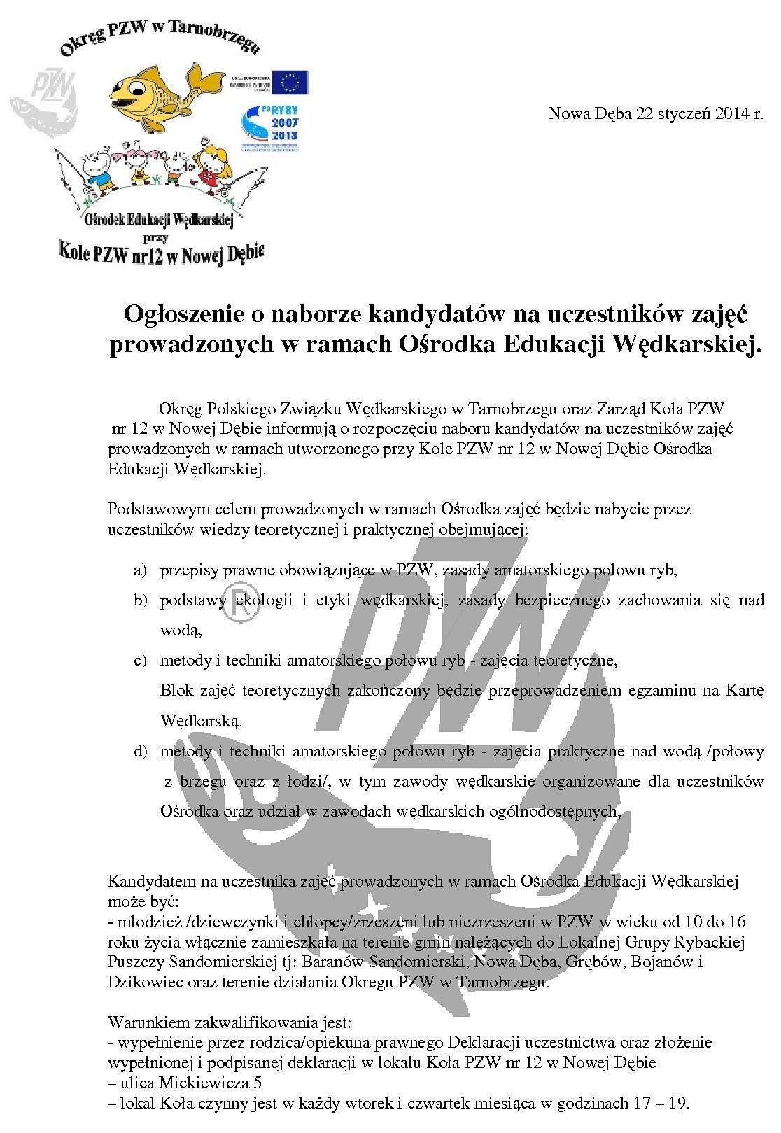 Ogłoszenie o naborze kandydatów na uczestników zajęć prowadzonych w ramach Ośrodka Edukacji Wędkarskiej