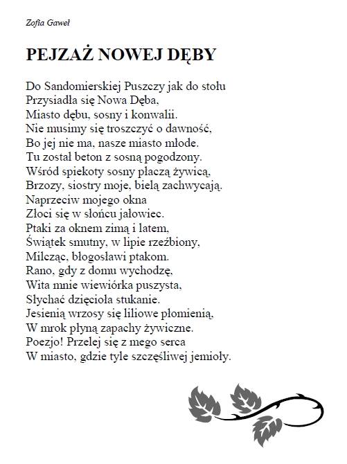 Wprawdzie jeszcze nie ukazały się one drukiem, ale dzięki uprzejmości jej syna Ryszarda, który obecnie mieszka we Wrocławiu, możemy zamieścić wiersz poświęcony Nowej Dębie - "Pejzaż Nowej Dęby".