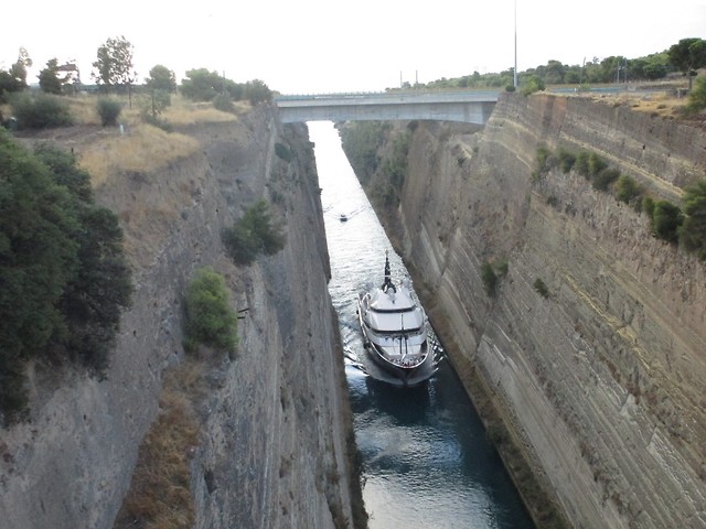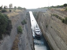 Byliśmy też nad kanałem Korynckim, który został oddany do użytku pod koniec XIX wieku. Dzięki niemu statki nie muszą objeżdżać półwyspu Peloponez, zaoszczędzając w ten sposób ok. 400 km drogi. Rocznie pokonuje go ok. 11 tysięcy mniejszych jednostek. Duże jednostki nie mogą z niego korzystać ze względu na wymiary - długość 6 km 343 m, szerokość na poziomie morza 24.6 m, szerokość na dnie 21 m, głębokość wody od lustra do dna 8 m, a głębokość od góry do lustra wody 79 m. Tak się szczęśliwie złożyło, że byliśmy świadkami przepływania większego okrętu i motorówek. Ten fakt został uwieczniony na pamiątkowych zdjęciach.